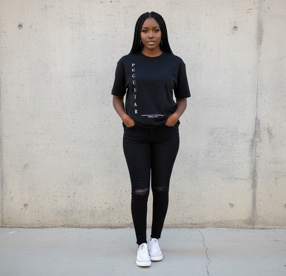 Ready to level up your tee game? This heavyweight drop shoulder shirt is here to shake things up. Simple, but bold work Peculiar stacked. Adding scripture at the bottom, just to make sure people are clear why you are peculiar. With its relaxed, oversized silhouette and quality construction, it's the kind of piece that feels as good as it looks. Layer it, style it solo, or make it your go-to for those days when comfort meets cool. Built tough enough to handle whatever you throw at it, this tee is your new favorite excuse to express your identity in Jesus Christ.